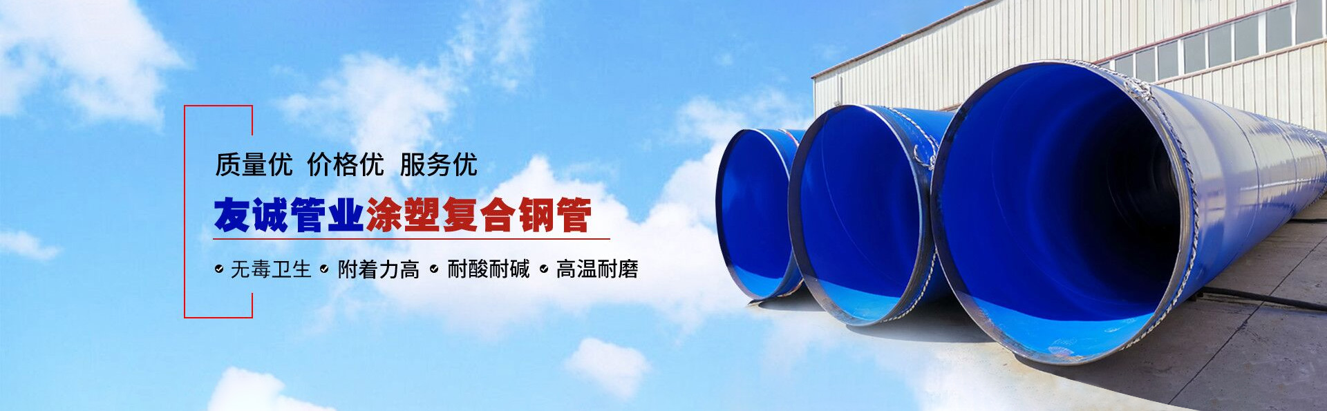 滄州友誠(chéng)管業(yè)有限公司是一家專(zhuān)業(yè)從事生產(chǎn)防腐涂塑管道及管件于一體的大型企業(yè)。公司注冊(cè)資金8600萬(wàn)元,位于中國(guó)管道生產(chǎn)基地—河北鹽山縣,近靠京滬高速、榮烏高速、黃石高速30公里,高鐵滄州西站40公里,天津國(guó)際機(jī)場(chǎng)、濟(jì)南遙墻機(jī)場(chǎng)150公里,為客戶(hù)來(lái)訪及業(yè)務(wù)發(fā)展提供了便利的交通條件。        鋼管系列:螺旋鋼管、無(wú)縫鋼管、ERW直縫焊管、JCOE埋弧焊直縫鋼管、熱鍍鋅鋼管。        涂塑系列:內(nèi)外涂塑鋼管、涂塑復(fù)合鋼…… 了解更多